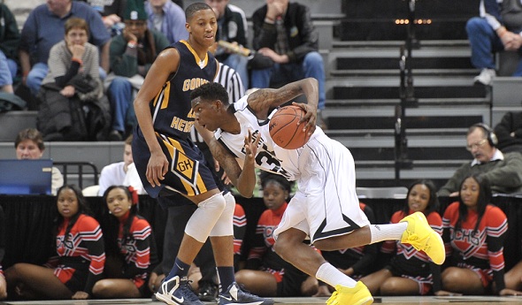 PHOTOS: (Top) Detroit Community's Byron Zeigler (35) tries to drive past Wyoming Godwin Heights' Markese Mayfield during Friday's Class B Semifinal. (Middle) Godwin Heights' Jamal Bland pushes the ball upcourt against a Community defender. (Photos by Hockey Weekly Action Photos.)