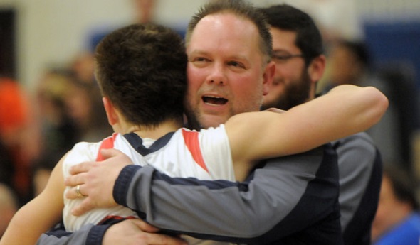 PHOTOS: (Top) Luke Lamoreaux and assistant coach Bill Szlaga share a celebratory embrace during Stevenson's Quarterfinal run. (Middle) Stacy Howard (3) prepares to signal a 3-pointer as teammate Austin Beba launches the shot. (Photos courtesy of the Sterling Heights Stevenson boys basketball program.)