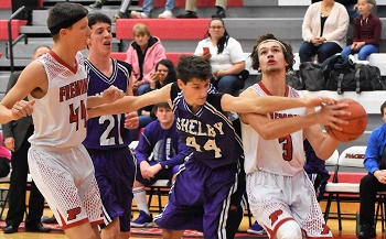 PHOTOS: (Top) Fremont 6-10 senior center Logan Karnemaat holds the ball up high, well out of the reach of two Shelby defenders, during a 75-50 season-opening win Nov. 27. (Middle) Fremont sophomore Braiden McDonald, one of the contributors off the Packers' deep bench, drives to the basket. (Photos by Russell Tindall.)