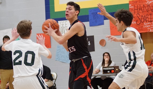 PHOTOS: (Top) Hannahville’s Joe Larson (14) looks for an open teammate during this past weekend’s Northern Lights League Tournament game against Mackinac Island. (Middle) Gage Sagataw brings the ball up the court. (Photos by Robyn Rhode.)