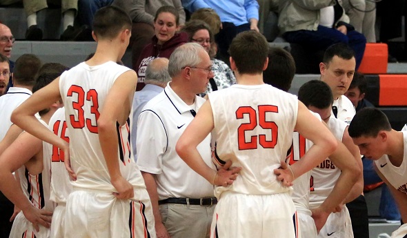 PHOTO: Stockbridge boys basketball coach Randy Swoverland huddles with his players during a break in the action this season. (Photo courtesy of Frazzini Photography.)