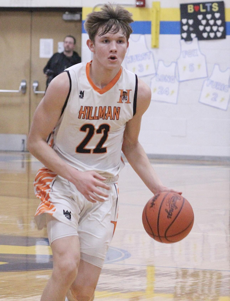 PHOTOS (Top) Hillman’s Trenton Taratuta (22) gets to the basket as the crowd anticipates two points. (Middle) Taratuta considers his next move during a game against Mio. (Photos courtesy of Jonny Zawacki.)