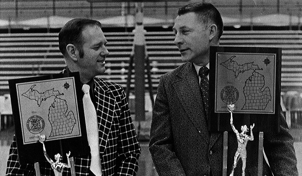 Holding these championship trophies are Vern Norris (left) and Al Bush, two of four who have served as executive directors of the MHSAA (Bush from 1968-78 and Norris as his successor until 1986 after serving as associate director).