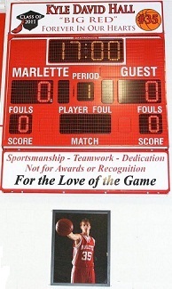 After earning all-league and all-area honors in his final high school season, Hall was slated to join the Alma College men’s basketball team this fall – in fact, the Scots wear his initials on their pre-game warm-up shirts. Alma College also recently acquired a new scoreboard, and Kyle “told me one time … I’m going to light that sucker up,” Reid remembered.