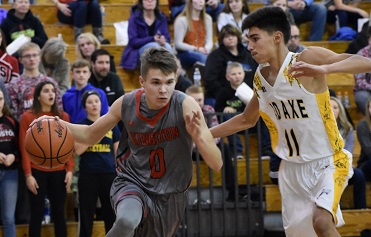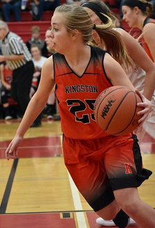 PHOTOS: (Top) Kingston’s Carley Smith, left, pushes the ball upcourt while junior Nathan Cloyd, right, launches a shot. (Middle) Gerilyn Carpenter looks for open teammates during a game this season. (Below) Sophomore Evan Neff works to get around a Bad Axe defender. (Photos by Spot On By Shari.)