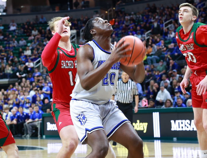 PHOTOS (Top) Wyoming Tri-unity Christian players begin to celebrate clinching the Division 4 championship Saturday at Breslin Center. (Middle) Akais Giplaye (20) begins a move to the basket with Sacred Heart’s Aidan Halliday defending. (Below) The Defenders’ Wesley Kaman (5) works to get up a shot over Noah Zeien. (Photos by Hockey Weekly Action Photos.)