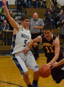 PHOTOS: (Top) Buckley’s Ridge Beeman (30) works to gather a loose ball against McBain Northern Michigan Christian on Dec. 8. (Middle) Joey Weber (5) blocks off a driving Bobcats player during the 86-39 win. (Photos courtesy of the Buckley athletic department.)