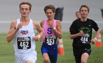 PHOTOS: (Top) Caro’s Yami Albrecht (415), Harbor Springs’ Jeremy Kloss (466) and Hanover-Horton’s Landon Melling (460) push each other late in Saturday’s Division 3 Final. (Middle) Hanover-Horton’s Bo Shepherd (462) leads Saugatuck’s Nik Pettinga (553) and Holland Black River’s Sam Sharnas (484) down the final stretch. (Click for more from RunMichigan.com.)