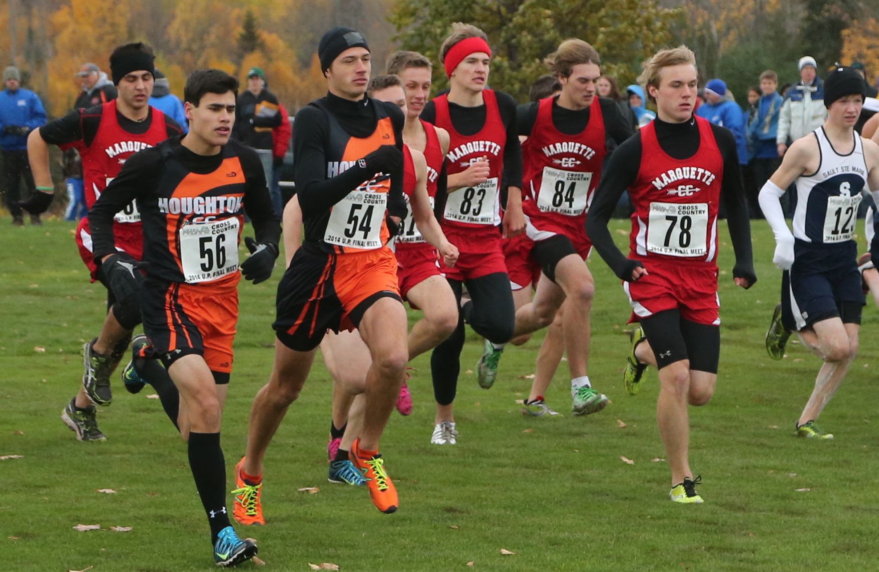 PHOTOS: (Top) Chassell, in blue with yellow piping, won its first MHSAA title since 1980 in claiming the Division 3 title Saturday. (Middle) Marquette’s pack moved to the front again in Division 1, claiming the team’s 22nd championship. (Below) Ironwood’s Jared Joki capped his stellar career with a repeat championship in Division 2. (Photo courtesy of RunMichigan.com/Paul Gerard.)