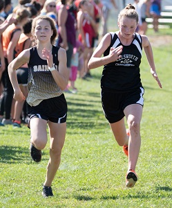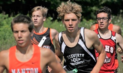 PHOTOS: (Top) The Ellsworth boys and girls cross country teams after a Northern Lakes Conference meet this season. (Middle) Judy Veldboom, right, tries to get past a St. Ignace runner near the finish line of the House on the Hill Invitational. (Below) Isaiah Romeyn runs with a pack during the Central Lake Invitational. (Top two photos by Olivia Adams; below photo by Chris Dobrowolski.)