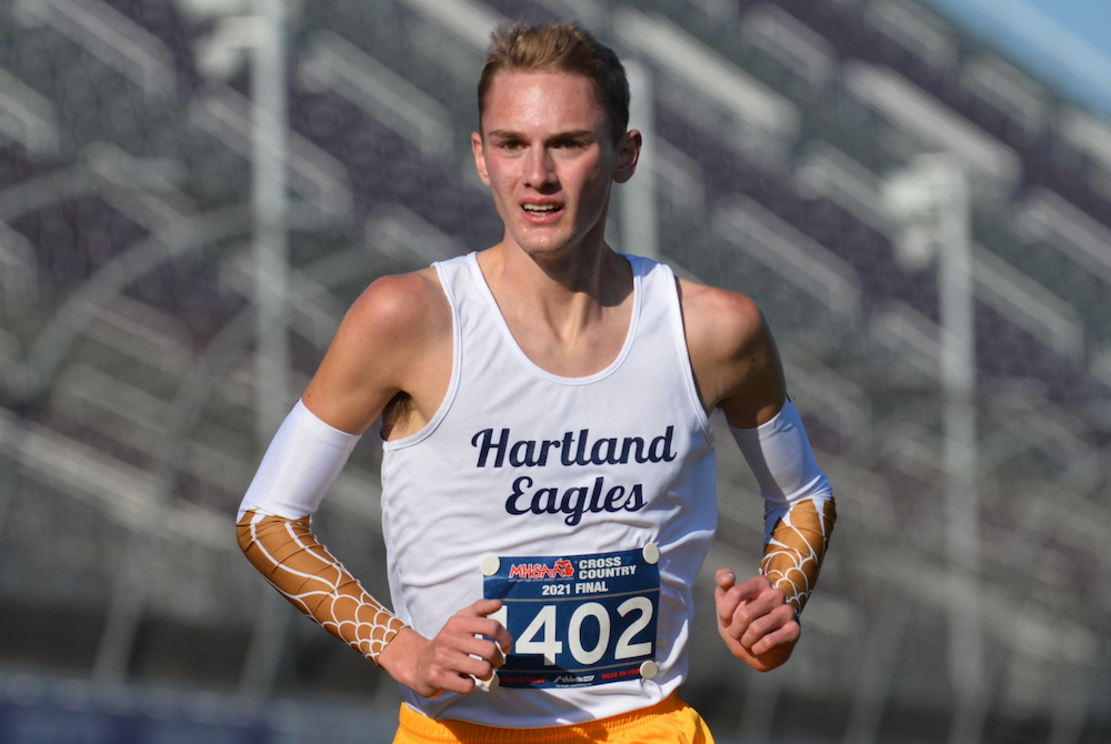 PHOTOS (Top) Hartland’s Riley Hough closes in on a repeat Division 1 championship Saturday. (Middle) Brighton’s Quinn Cullen leads a pack toward the finish while setting the pace for the eventual team title winner. (Click for more from RunMichigan.com.)