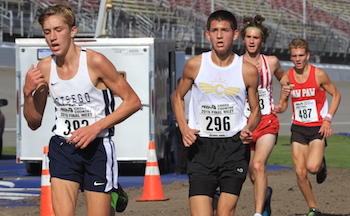 PHOTOS: (Top) Corunna’s Noah Jacobs charges toward the finish for his first MHSAA cross country title. (Middle) Ben Jacobs (296), Noah’s brother, finished eighth to help the Cavaliers to their first team title since 1997, while Otsego's Alex Comerford (392) also posted a top-10 finish. (Click to see more from RunMichigan.com.)