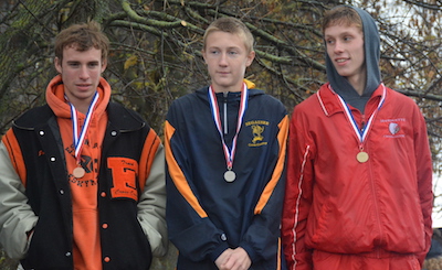 PHOTOS: (Top) Munising's Brett Hannah breaks away from the Division 3 pack to claim his second individual title in four seasons. (Middle) From left, Escanaba's Joey Wolfe, Negaunee's Colton Yesney and Marquette's Lance Rambo were the top finishers in Division 1. (Below) Gogebic's Sam Dean rounds a bend on the way to winning the Division 2 title. (Photos by Cara Kamps.)