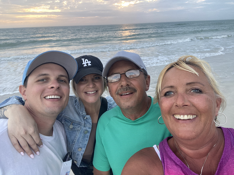 PHOTOS (Top) At left, Maverick Darling crosses the finish line during a race as an Ovid-Elsie senior in 2007; at right Darling poses with fiancé Danielle. (Middle) Darling rounds a turn during a high school race. (Below) Darling and Danielle enjoy a sunset over the water with her parents. (Photos courtesy of Maverick Darling.)