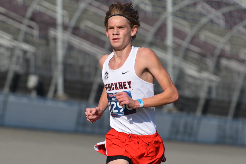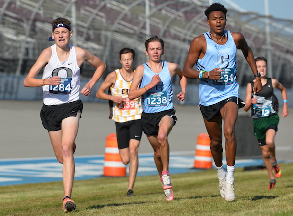 PHOTOS (Top) Pinckney’s Caleb Jarema closes in on his first MHSAA Finals championship Saturday afternoon. (Middle) Otsego’s Nick Cockerel (1284) and Grand Rapids Christian’s Tinsae Nelson (1234) and Ben Zwart (1238) make their push toward the finish. (Click for more from RunMichigan.com.)