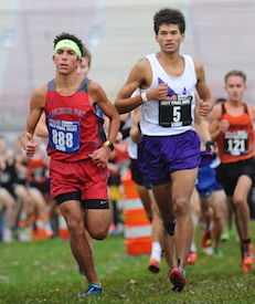 PHOTOS: (Top) Ann Arbor Pioneer’s Nick Foster crosses the finish line at Saturday’s Division 1 Final. (Middle) Pioneer’s Aldo Pando-Girard (5) and New Baltimore Anchor Bay’s Michael Zedan (888) race through a stretch. (Click for more from RunMichigan.com.)