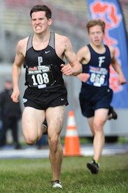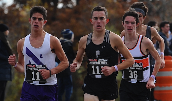 PHOTOS: (Top) Ann Arbor Pioneer’s Nick Foster (11), Plymouth’s Carter Solomon (111) and Brighton’s Zachary Stewart (36) lead the pack near the midway point of the Division 1 Final. (Middle) Plymouth’s Patrick Byrnes pushes down the final stretch. (Click for more from RunMichigan.com.)
