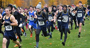 PHOTOS: (Top) Gogebic's Uriah Aili (217) leads the Division 2 pack Saturday with Ishpeming's Spencer Giroux (161) and their teammates Devon Byers (219) and Jonah Broberg (159) following close behind. (Middle) Gladstone's Adam Bruce heads down the home stretch on the way to finishing first in Division 1. (Below) Chassell placed five of the top 13 in Division 3; here Ben Tuomi (258), Kurtis Kytta (255), Gabe Torola (257), Kolson Kytta (254), Abraham Gockenbach (252) and Elijah Soumis (256) break out of the start together. (Photos by Cara Kamps. Click for more at RunMichigan.com.)