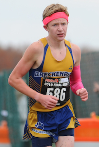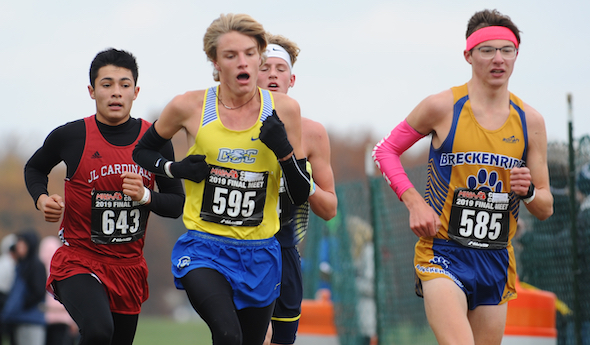 PHOTOS: (Top) Breckenridge’s Mason Sumner (585) begins his move ahead of Carson City-Crystal’s Coleman Clark, Johannesburg-Lewiston’s Carlos Gascho and Webberville’s Nathan Lott. (Middle) Colttion Vine keeps pace as Breckenridge’s second runner to earn a top-10 finish. (Photos by Dave McCauley/RunMichigan.com.)