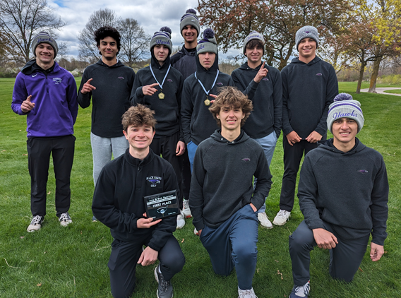 PHOTOS (Top) Bloomfield Hills’ Lucas Dostal shows the ball he drove into the hole next to him for a par-4 hole-in-one April 20 at Hudson Mills Metro Park. (Middle) Dostal, standing third from right, is joined by his team after they won the Ace & Bob Byerlein JV Tournament that day. (Photos courtesy of the Bloomfield Hills JV golf program.)