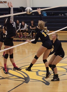 PHOTOS: (Top) Allen Park Cabrini’s Katie Logan putts to finish off a hole this season. (Middle) Logan tries to send a spike through an opposing block during volleyball season in the fall. (Photos courtesy of the Allen Park Cabrini athletic department.)