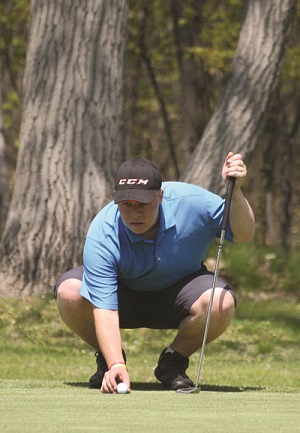 PHOTOS: (Top) Carney-Nadeau’s Hunter Eichhorn unloads a shot en route to a first-place 68 at Thursday’s Upper Peninsula Division 3 Final. (Middle) Painesdale-Jeffers’ Jacob Zerbst lines up a putt on No. 14 at Irish Oaks Golf Club. (Photos by Keith Shelton.)
