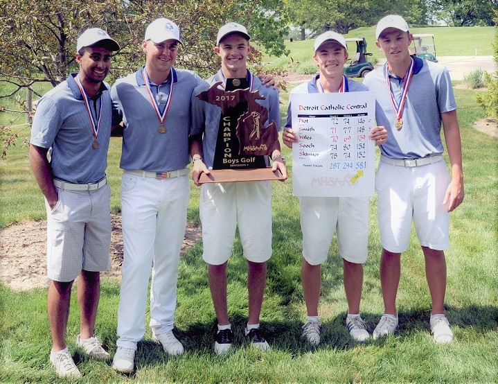 PHOTOS: (Top) Detroit Catholic Central grad James Piot, now playing at Michigan State, keeps an eye on his shot during a 2020 Golf Association of Michigan event. (Middle) Piot, second from right, stands with his Detroit Catholic Central team after the Shamrocks had clinched their third-straight Finals championship in 2017. (Top photo courtesy of Golf Association of Michigan; middle photo by HighSchoolSportsScene.com.)