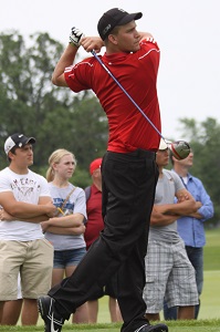 PHOTOS: (Top) Kalamazoo Hackett’s Ted Rider tees off during the individual playoff Saturday at Forest Akers East. (Middle) Manistee Catholic Central’s Zack Bialik watches one of his tee shots during the playoff. (Click to see more at HighSchoolsSportsScene.com.)