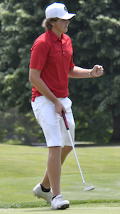 PHOTOS: (Top) Hanover-Horton’s Brody Spink watches one of his drives during Friday’s first round of the LP Division 3 Final. (Middle) Big Rapids’ Pierce Morrissey pumps a fist after making a putt. (Click to see more from HighSchoolSportsScene.com.)