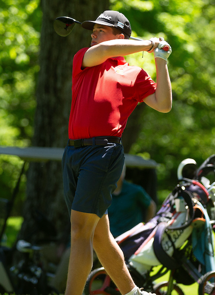 PHOTOS (Top) Iron Mountain's Cooper Pigeon drives on No. 14 at Young’s Golf Course on Wednesday. (Middle) Hancock’s Jackson Sintkowski follows his drive on the same hole. (Photos by Jason Juno.)
