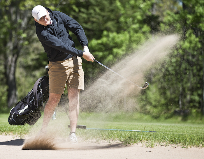 PHOTOS (Top) Norway’s Carson Chartier putts on a windy 18th green during Wednesday’s Upper Peninsula Division 2 Final at Young’s Golf Course. (Middle) St. Ignace’s Ely North advances his ball out of a bunker on the 17th hole. (Photos by Jason Juno.)