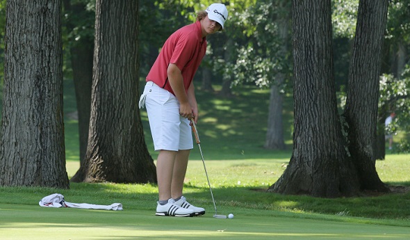 PHOTOS: (Top) Ada Forest Hills Eastern’s Bradley Smithson lines up a putt during the 2016 Lower Peninsula Division 2 Final at Bedford Valley. (Middle) Smith, front and third from left, stands with the rest of the individual leaders after last season’s Final at The Meadows at Grand Valley State University. (Click to see more from HighSchoolSportsScene.com.)
