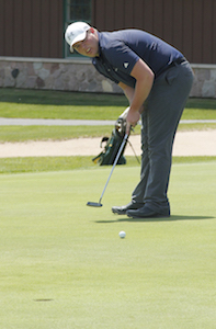 PHOTOS: (Top) A player tees off during the Upper Peninsula Division 2 Finals on Thursday. (Middle) Norway’s Brad Schalow sends a putt on the way to finishing individual runner-up. (Photos by Adam Niemi.)