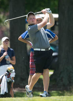 PHOTOS: (Top) Tawas’ Bryce Myles responds enthusiastically during Saturday’s second round of the Lower Peninsula Division 3 Final. (Middle) Macomb Lutheran North’s Scott Sparks watches a shot at Forest Akers East. (Click to see more from HighSchoolSportsScene.com.)