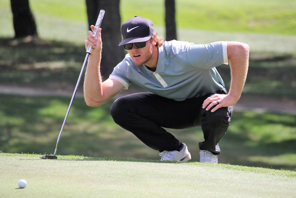 PHOTOS: (Top) Grand Rapids’ Ben Cook reads a putt during the 2020 Michigan PGA Professional Championship, which he won. (Middle) Cook watches one of his drives at Katke Golf Course during the 2012 LP Division 2 Final. (Top photo by Greg Johnson/Michigan PGA. Middle photo by High School Sports Scene.)