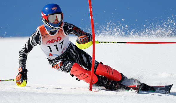 PHOTOS: (Top) Marquette's Aaron Grzelak races toward a first-place finish in slalom Monday. (Middle) Rockford's Nick Rupert cuts through a turn during the giant slalom. (Click for more from HighSchoolSportsScene.com.)