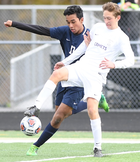 PHOTOS: (Top) Leland players celebrate Jesus Calderon-Balcazar’s goal, which proved to be the game-winner, during last Saturday’s Division 4 Final against Ann Arbor Greenhills. (Middle) The Comets’ Wyatt Sirrine, right, works to keep possession against Greenhills’ Nikhil Shrinivasan.
