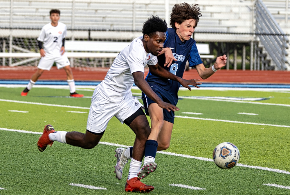PHOTO Westland John Glenn and Sterling Heights Stevenson players pursue the ball during their matchup this season. (Photo by Douglas Bargerstock.)