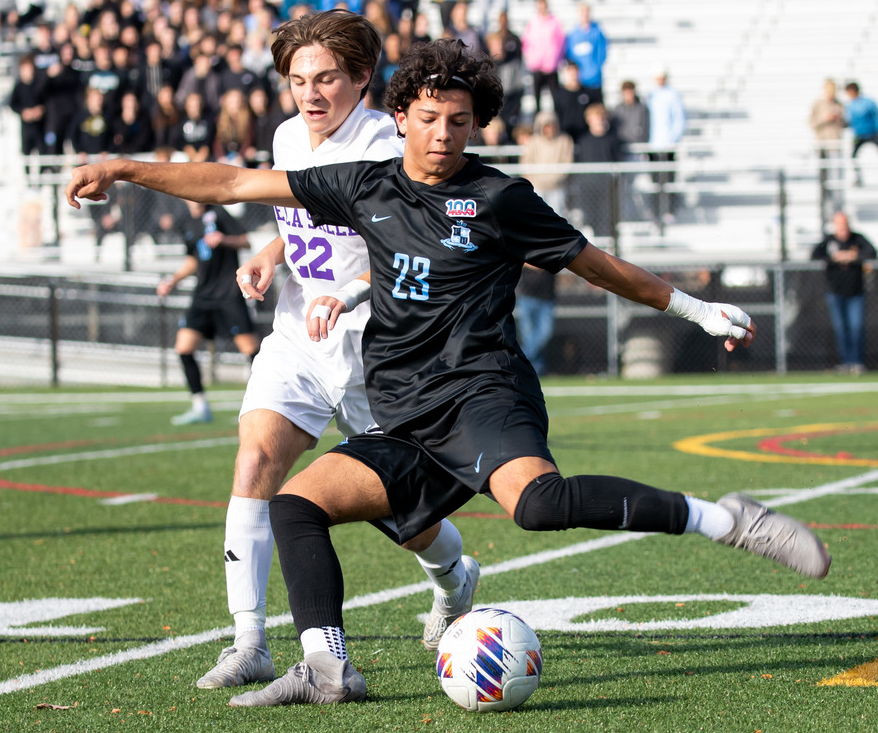 PHOTOS (Top) De La Salle’s Vince Houlihan (19) controls the ball while two Forest Hills Northern players attempt to gain possession. (Middle) FHN’s Drin Mandija (23) winds up to send the ball forward with the Pilots’ Josh Ross in pursuit. (Below) De La Salle’s Andrew Corder maintains possession. (Photos by Adam Sheehan/Hockey Weekly Action Photos.)