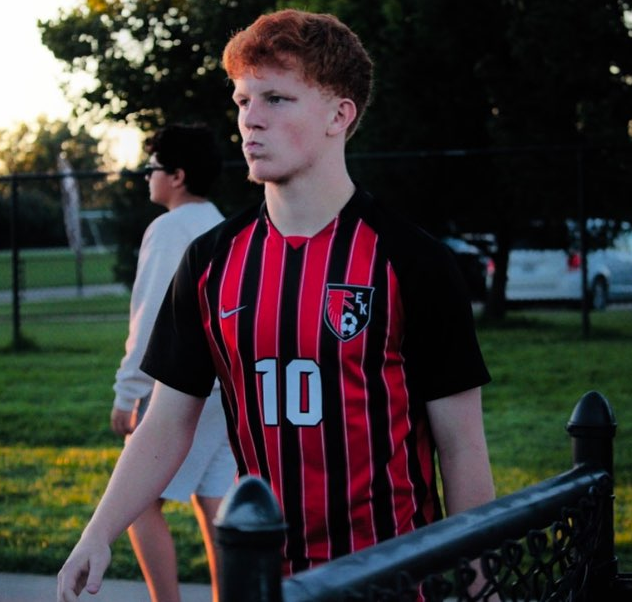PHOTOS (Top) East Kentwood’s Brody Conlon (10) returned to the field this fall with his high school team. (Middle) Brody Conlon, far right, takes a photo with past East Kentwood star Nermin Crnkic, center, two summers ago. (Below) Conlon reached double-digit goals and assists this season. (Photos courtesy of the Conlon family.)