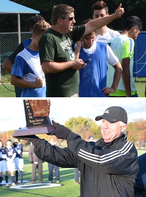 PHOTOS (Top) De La Salle boys soccer coach Thaier Mukhtar holds up his team’s championship trophy after the Pilots clinched the Division 2 title Nov. 1 at Grand Ledge High School. (Middle) Mukhtar embraces keeper Giovanni Vitale after his team’s 2024 championship win.