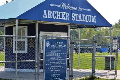 PHOTOS: (Top) East Lansing players scrimmage during Tuesday’s practice at Archer Stadium. (Middle) Coach Jeff Lyon instructs the Trojans on the practice plan, and below, Nick Archer raises the team’s 2014 championship trophy. (Below) The entrance to the East Lansing Soccer Complex bears Archer’s name and the program’s accomplishments under his leadership.