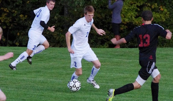 PHOTO: Burt Lake Northern Michigan Christian's Aaron Chatfield dribbles through defenders during a game earlier this season (Photo courtesy of the Petoskey High School soccer program.)