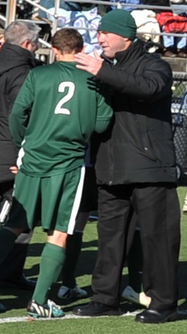 PHOTOS: (Top) Williamston boys soccer coach Brent Sorg, left, shares hands with Hudsonville Unity Christian's Randy Heethuis after last season's Division 3 Final. (Middle) Sorg has been a college official for 15 seasons, including during this ACC championship game. (Below) Sorg comforts one of his players after the Division 3 Final loss.