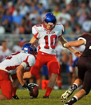 PHOTOS: (Top) Mason goalkeeper Josh Flamme prepares for an Okemos free kick during the team's 0-0 tie this season. (Middle top) Flamme launches a kick downfield against the Chieftains. (Middle bottom) Flamme also is the placekicker for Mason's football team. (Bottom) At 6-feet tall, Flamme excels at making saves at the top of the goal. (Photos courtesy of Alan Holben.)
