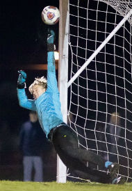 PHOTOS: (Top) Muskegon Western Michigan Christian's Jameson Goorman lines up a kick downfield. (Middle) Goorman makes a save during the Warriors' Regional Final shootout win last week over Grandville Calvin Christian. (Photos by Randy Riksen.)
