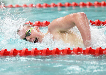 PHOTOS: (Top) Swimmers launch during Saturday’s Upper Peninsula Finals at Marquette High school. (Middle) Sault Ste. Marie’s Andrew Innerebner completes his meet record 500 freestyle. (Photos by Daryl Jarvinen/Jarvinen Photos.)