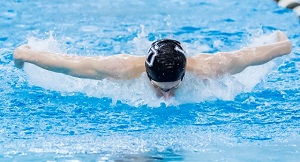 PHOTOS: (Top) Holland West Ottawa's Derek Maas competes during a meet this season. (Middle) Maas swims the butterfly. (Photos courtesy of the West Ottawa boys swimming & diving program.)