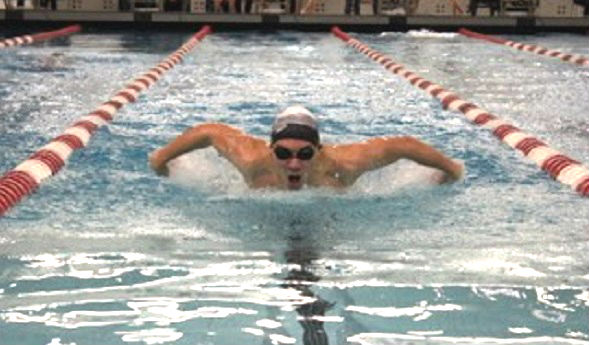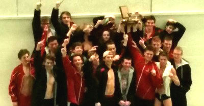 PHOTOS: (Top) Spring Lake's Eric Schock swims the butterfly during a meet this season. (Middle) Spring Lake athletes wave to the crowd with trophy in hand. (Photos courtesy of the Schock and Rick families).