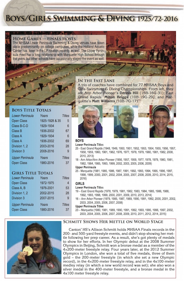 The MHSAA's history with boys swimming & diving goes to the start of the association, in 1925, and in 1972 one of our first girls sports also found its home in the pool. Just more than four decades later, one of the best-known Michigan high school standouts – Canton's Allison Schmitt – is one of six captains of this Olympics' U.S. national swim team.